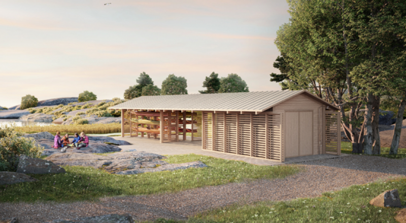 Slik vil det nye naustet med oppbevaring av kano og utstyr se ut. Foto: Line Solgaard Arkitekter