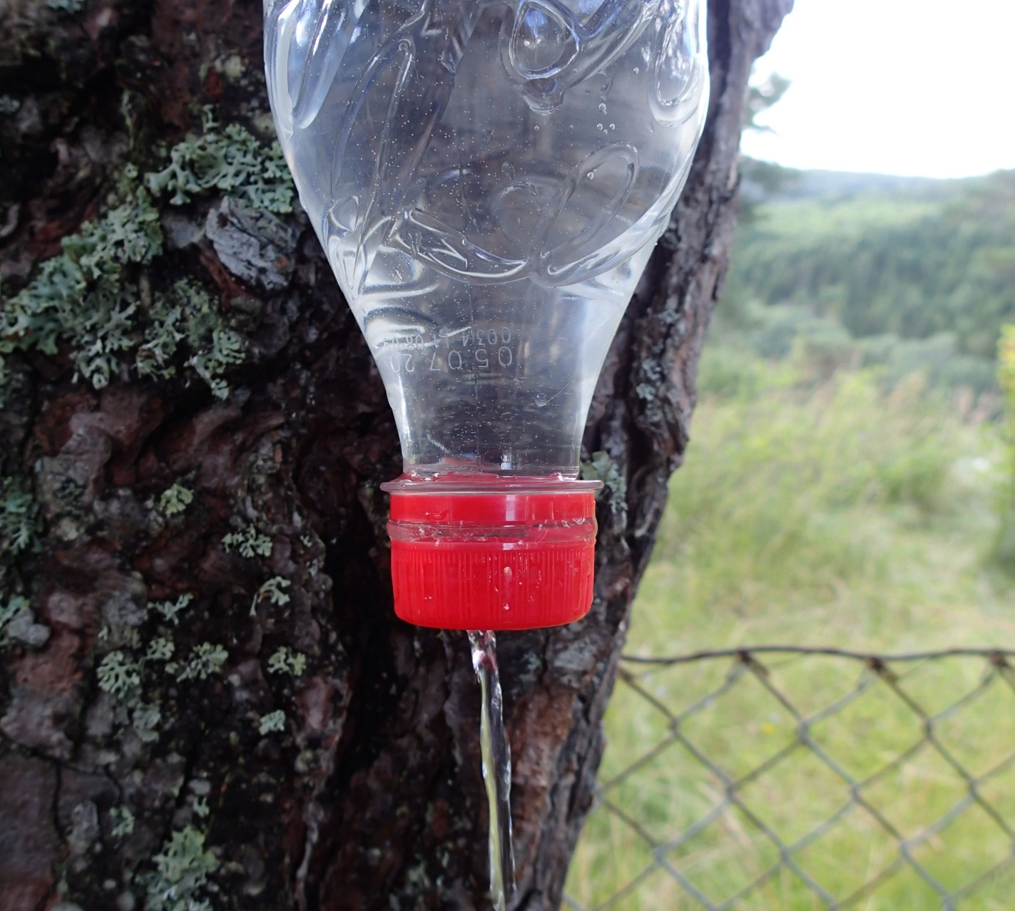 Så kommer den vanskelige delen. Hele innretningen skal festes til et tre, slik at flaska havner med tuten ned. Bruk godt med tau, slik at pinnene og flaska holder seg godt på plass. Pass på å henge opp i en høyde som gjør det mulig å nå opp til pinnene med albuen. Tenk også på at det kan bli behov for å løsne flaska for å fylle den på.